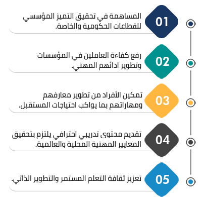 تقديم استشارات تطويرية وبرامج تدريبية احترافية تواكب المستجدات وتسهم في تطوير راس المال البشري من خلال بيئة تعليمية محفزة ومدربين مؤهلين ومحتوي تدريبي متجدد وفعال.